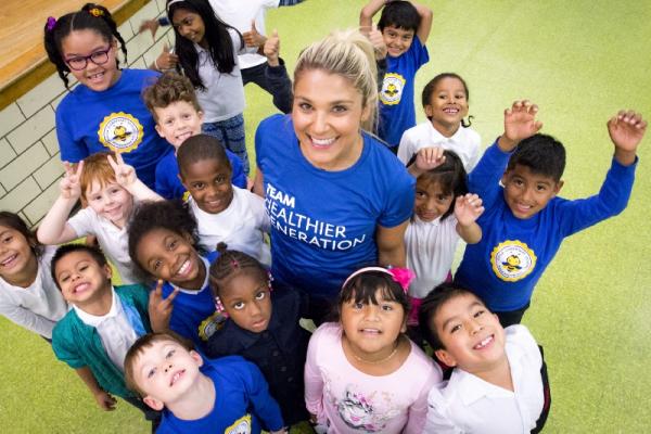 As Team Healthier Generation’s Official Celebrity Fitness Coach, Anja Garcia visited a local elementary school, where students shared what they have learned through the support of the Healthy Schools Program. From a school garden tour to seeing a kindergarten class share their favorite classroom physical activity break, Anja and Alliance representatives experienced the impact of our mission first-hand. The highlight of this school visit was inviting approximately 40 students to take part in a kid’s fitness workshop, led by Anja Garcia.