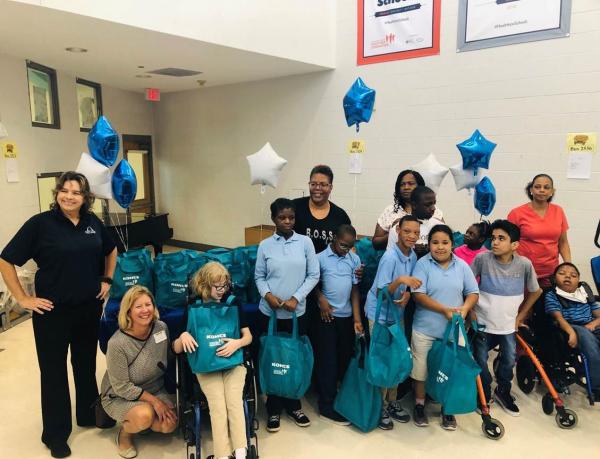Students receive their bags at Gateway Michael (St. Louis Public Schools).