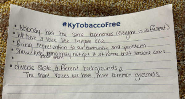 - During the Kentucky Youth Tobacco Control Workshop, the question youth discussed was, “Why does the voice of Kentucky youth matter?”