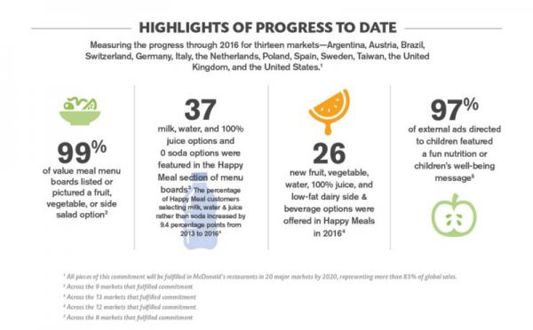 - 716 million new fruit, vegetable, or low-fat dairy side items were served in Happy Meals and a la carte across 13 participating markets between 2014 and 2016.