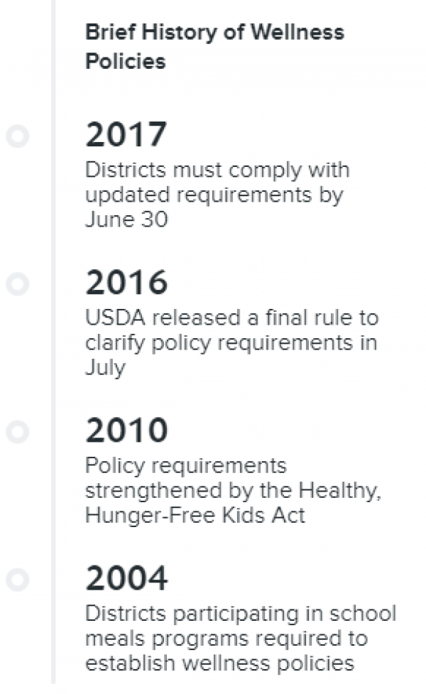 Since 2004, any district participating in federal nutrition programs is required to create a wellness policy, and the USDA has strengthened the policy requirements over time. Key changes to wellness policies include: